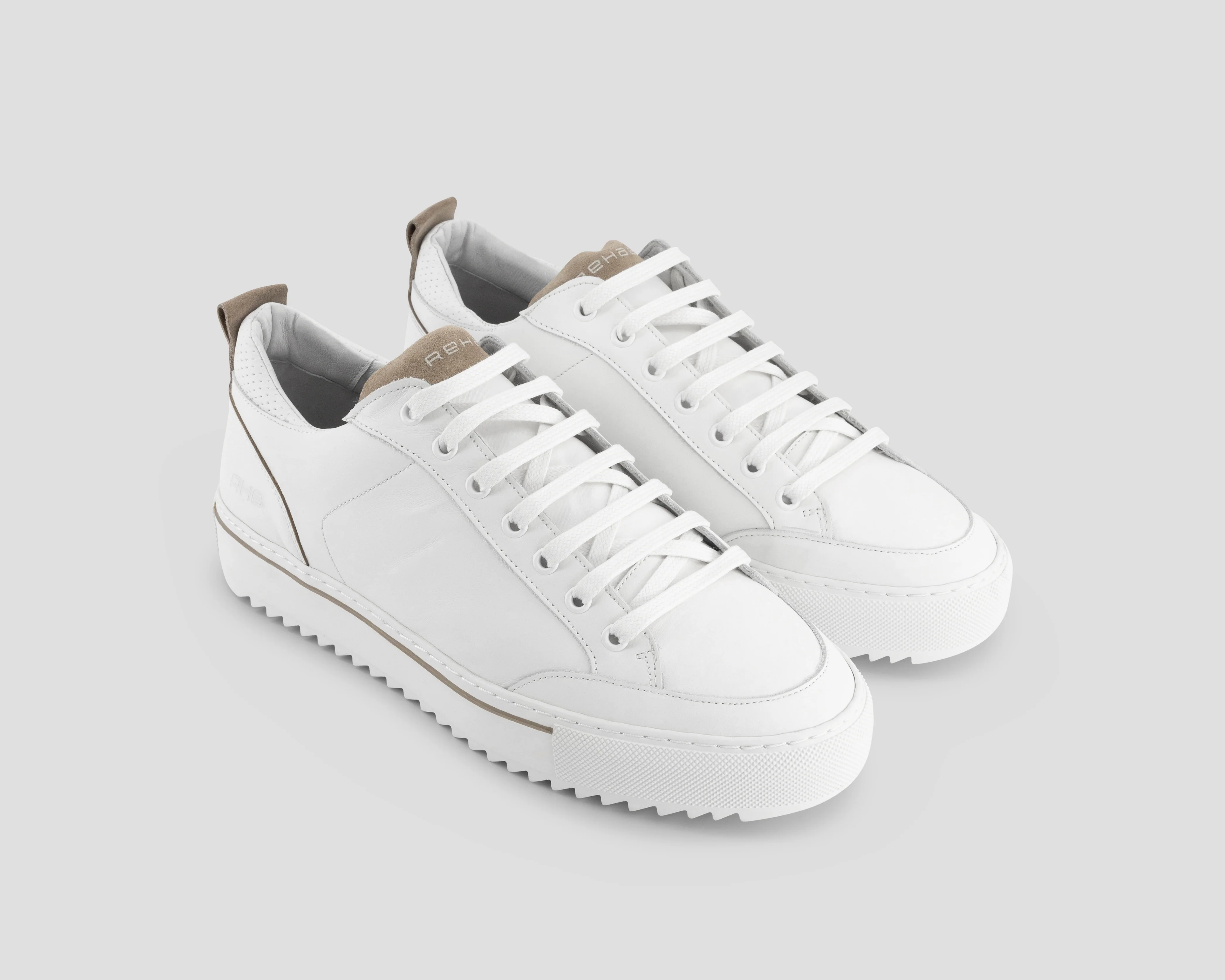 Wit-khaki sneaker van leer met katoenen veters en stevige rubberzool. Fris, clean en sportief – combineer moeiteloos met jeans of chino.