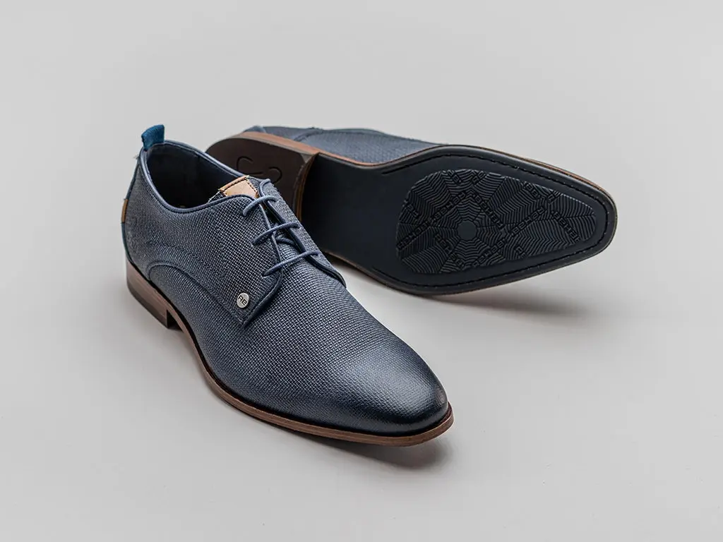 Donkerblauwe veterschoen van buffalo-leer met verfijnde structuur en zachte loopzool. Comfortabel en classy – ideaal voor dagelijks gebruik of een avond uit.