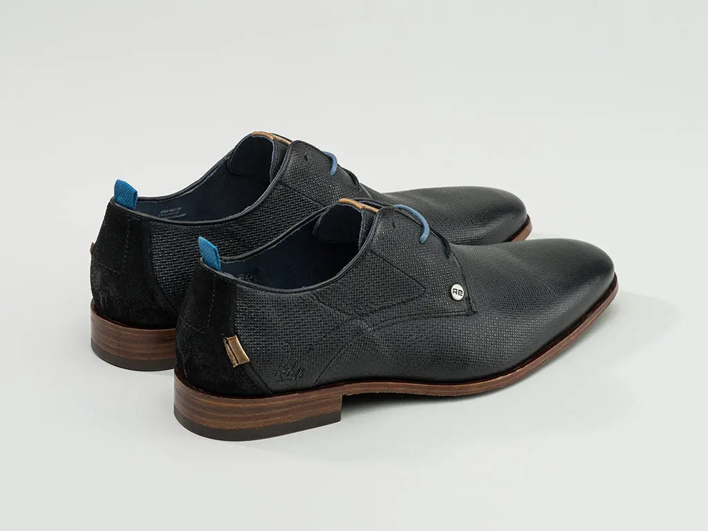 Zwarte veterschoen van glad buffalo-leer met subtiele print en soepele zool. Minimalistisch design met veel karakter voor werk en formele gelegenheden.