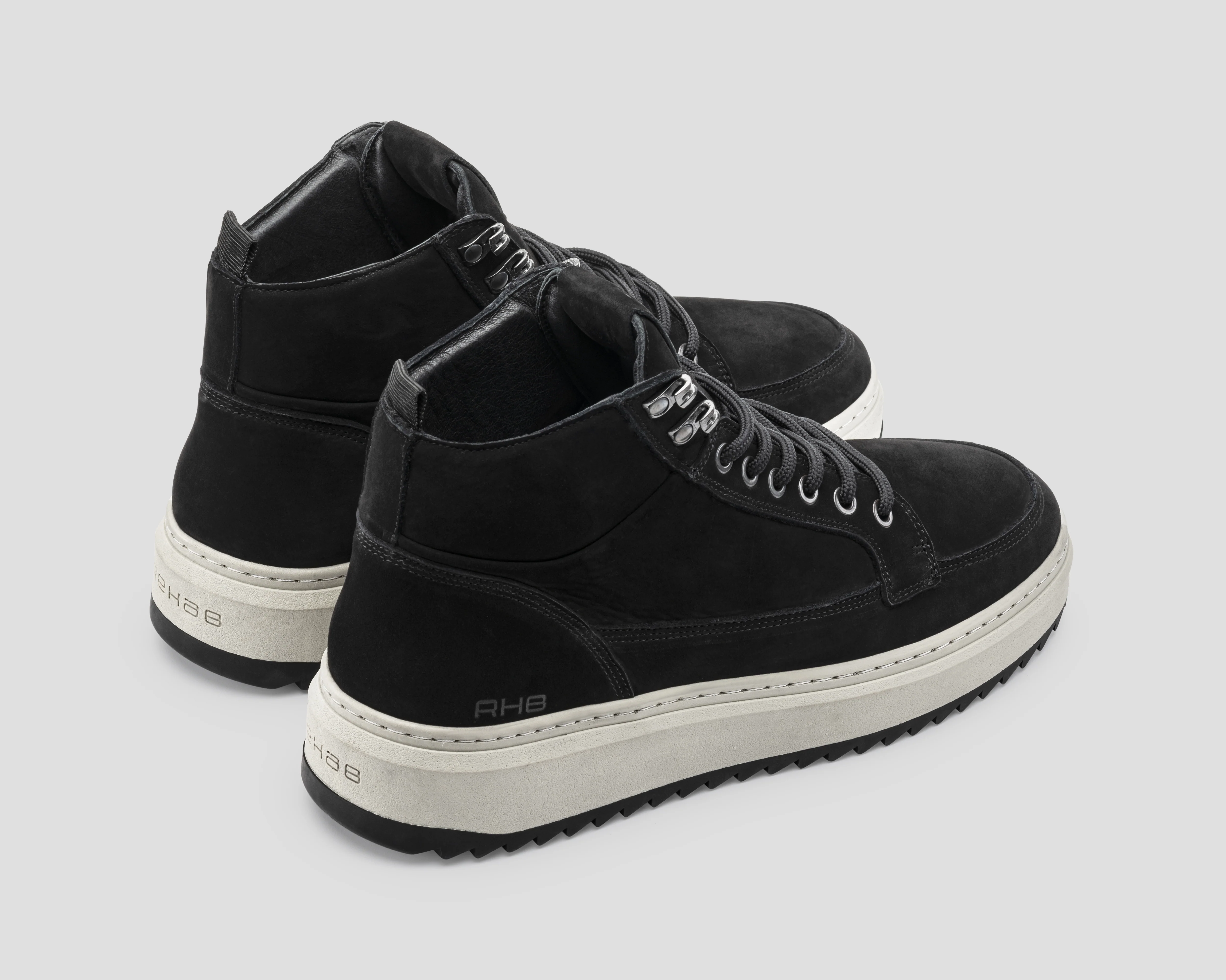 Zwarte nubuck boot met gekartelde zool en spiegelneus. De REHAB-zool geeft comfort. Perfecte mix van stijl en robuustheid.