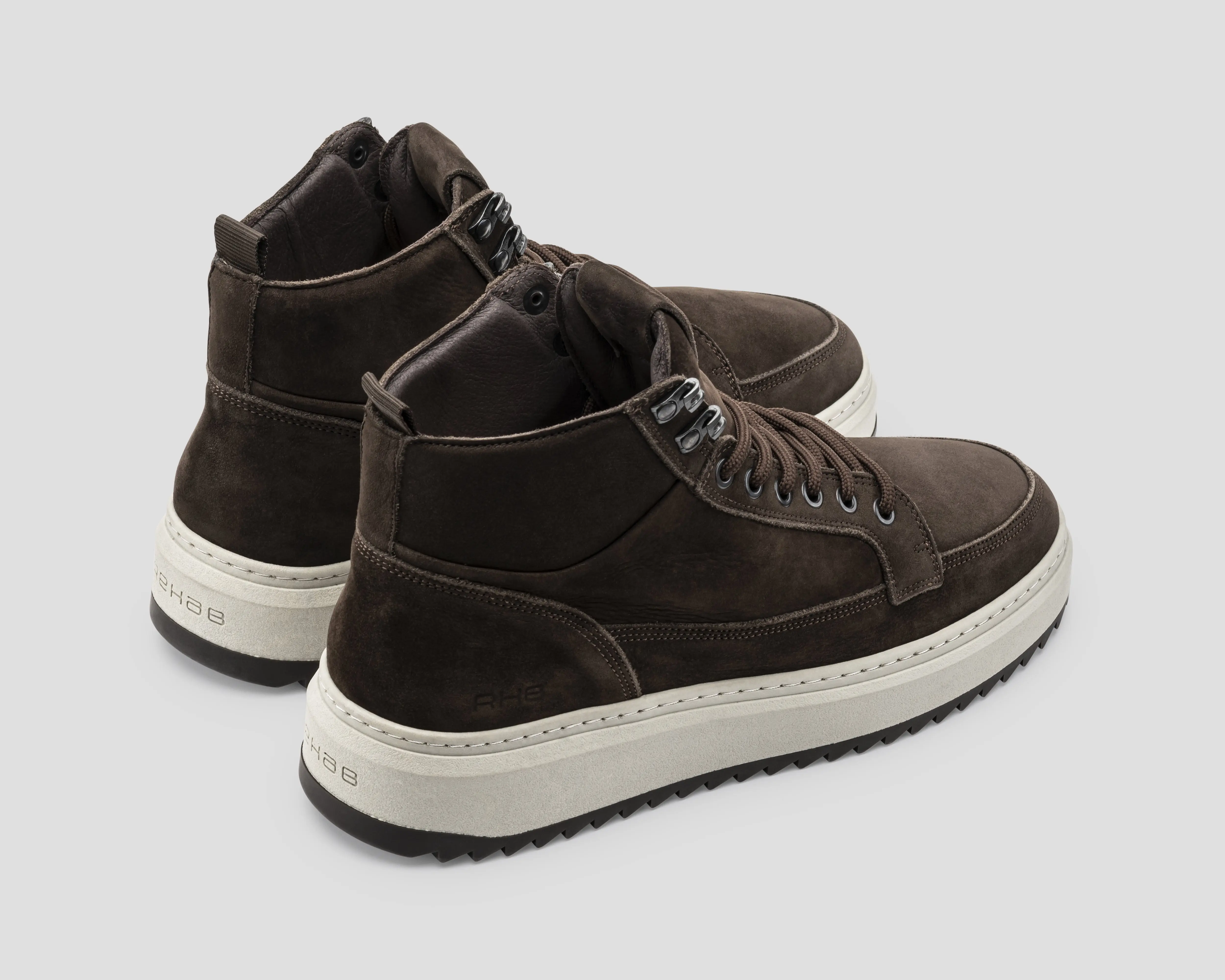 Donkerbruine boot van nubuck met gekartelde zool en spiegelneus. De REHAB-zool biedt comfort. Stoer onder een jeans.