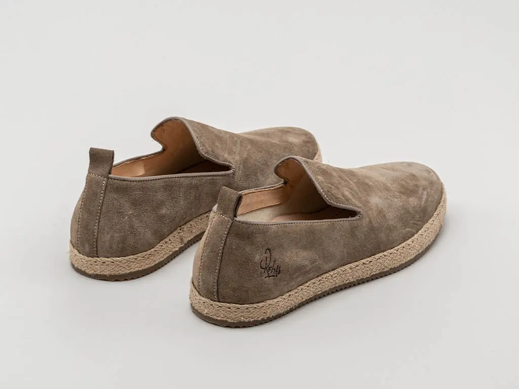 Zomerse instapper voor heren gemaakt van mooie kwaliteit suede en comfortabele rubberen zool met afwerking van gevlochten touw. Draag deze instappers onder een zomerse chino.