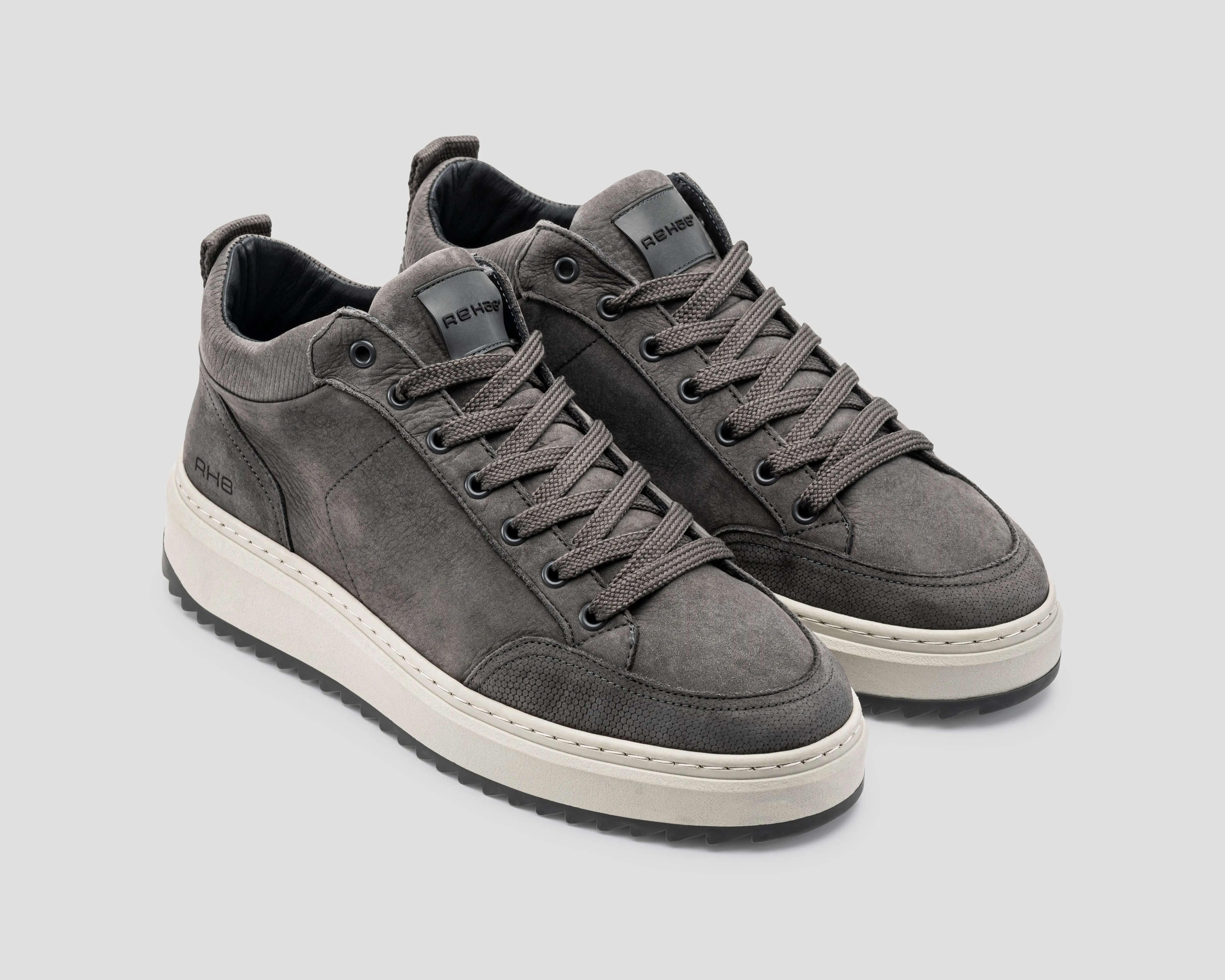 Donkergrijze nubuck sneaker met robuuste details en stevige zool. Perfect voor mannen met lef en stijl.