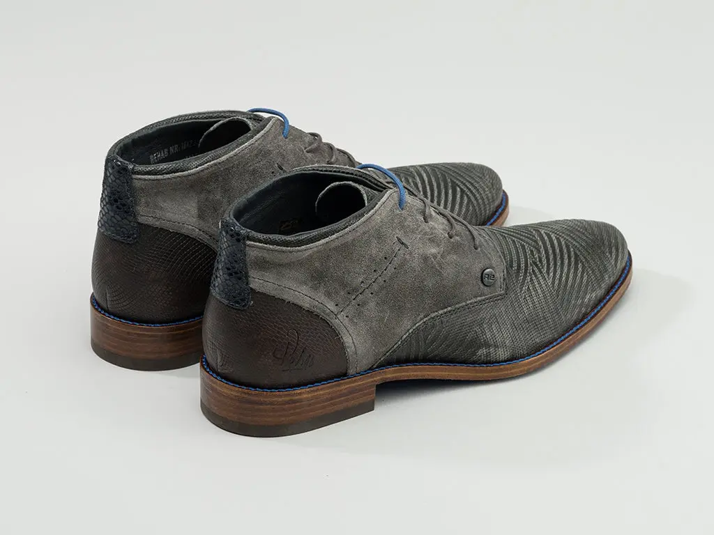 Grijze halfhoge veterschoen van leer en suède met subtiele zigzagstructuur. Een verfijnde keuze voor zowel zakelijk als casual gebruik.