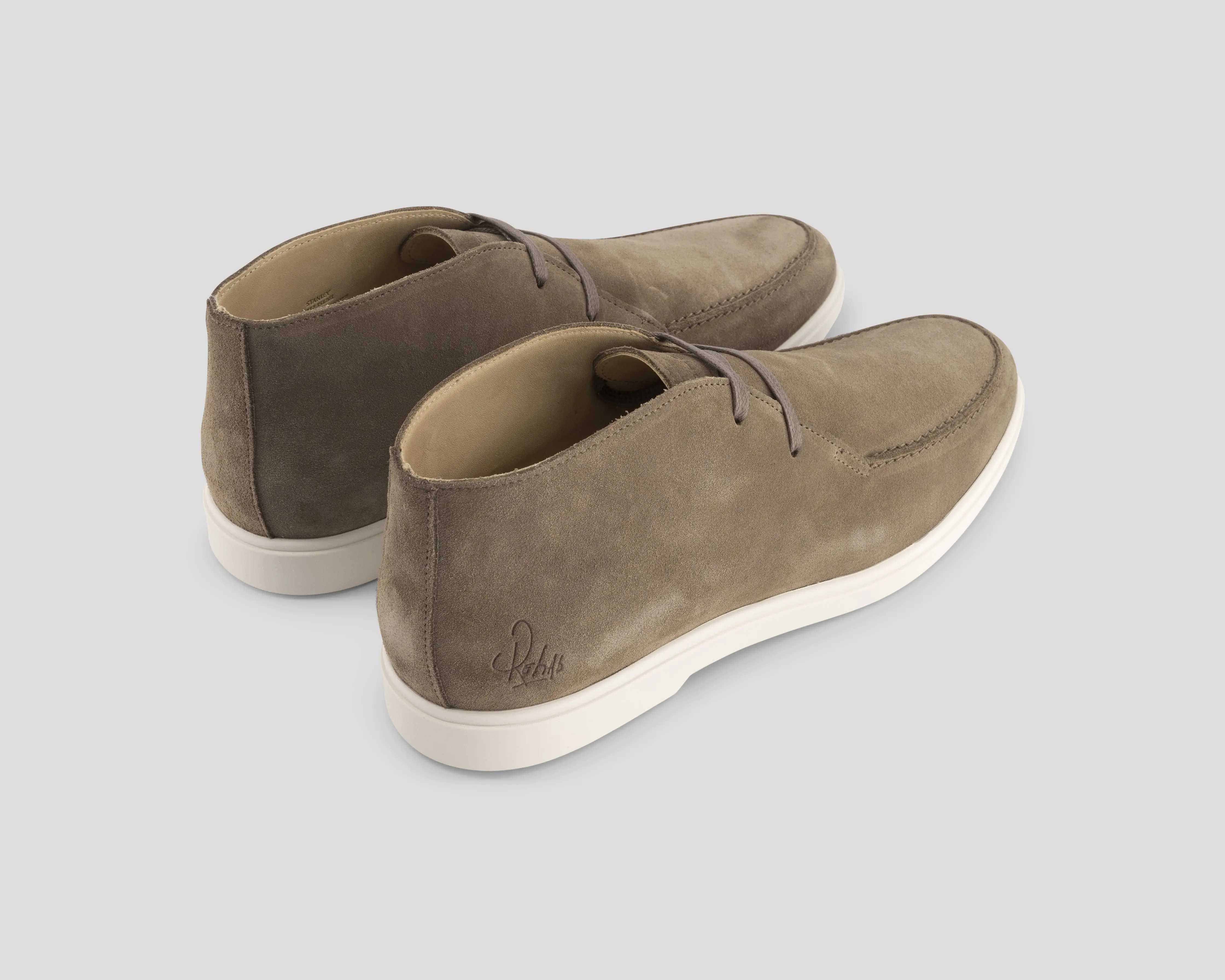 Nette halfhoge veterschoen uitgevoerd in een mooie, zachte kwaliteit suede in de kleur taupe. Voorzien van een comfortabele, lichtbeige zool voor een klassieke look. Combineer eenvoudig met een mooie chino of jeans voor een casual chic look.
